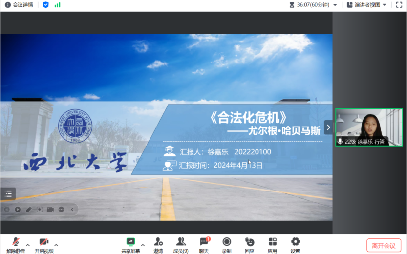 2024年4月13日上午,我院于线上举办了2024年第8期正学读书会。西北大学565net必赢2021级应急管理专业硕士研究生刘泓贤、2022级行政管理专业硕士研究生张雨婷、徐嘉乐,2021级应用心理学专业硕士研究生王佳乐、2022级社会保障专业硕士研究生田雨浠、2023级行政管理专业硕士研究生赵俊超分别作为主讲人进行读书汇报,565net必赢2023级博士研究生贺晓迎担任评议人,部分研究生旁听了此次报告会。