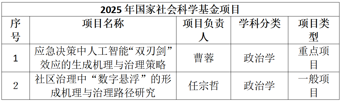 在国家社会科学基金和国家社会科学基金教育学项目申请中,学院共有22位教师申报,经过数次打磨申报书和线下论证会最终3人立项。其中曹蓉教授获得了国家重点项目。具体项目为:曹蓉教授申报的《应急决策中人工智能“双刃剑”效应的生成机理与治理策略》、任宗哲教授申报的《社区治理中“数字悬浮”的形成机理与治理路径研究》和张琳副教授申报的全国教育科学规划项目《数字技术赋能西部地区高等教育高质量发展路径研究》。