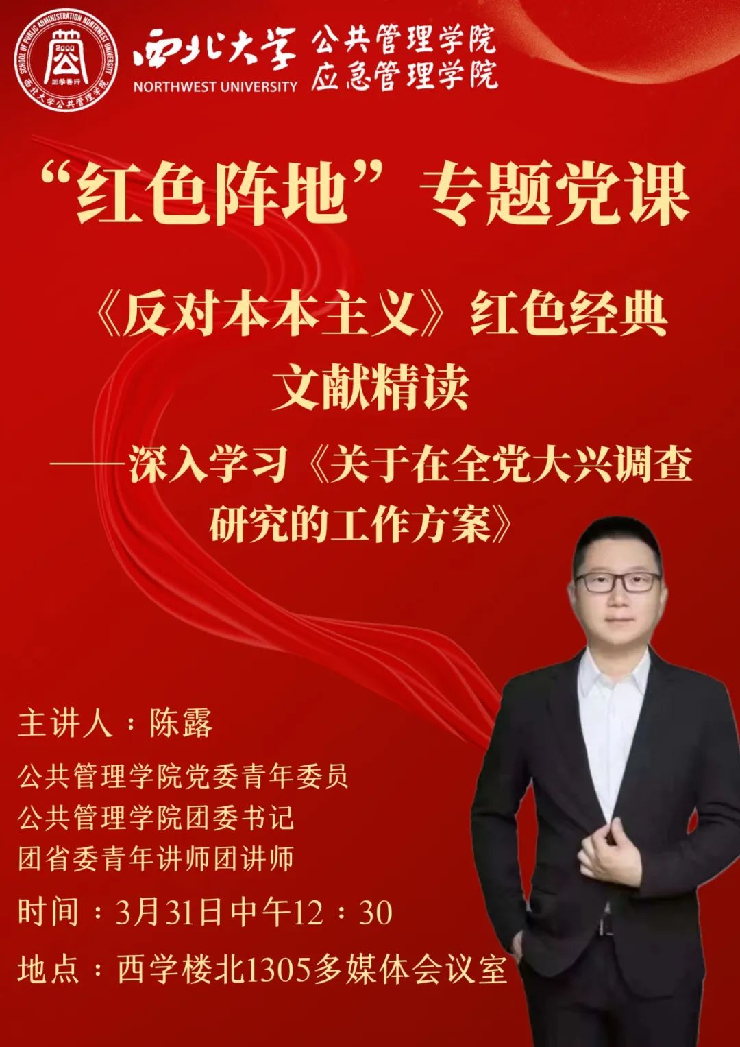 本次讲座中,陈露老师将和同学们一同精读《反对本本主义》等红色经典文献,领学《关于在全党大兴调查研究的工作方案》,带领同学们深入学习领会习近平新时代中国特色社会主义思想,全面贯彻落实党的二十大精神,对党的调查研究工作产生新的体悟。
