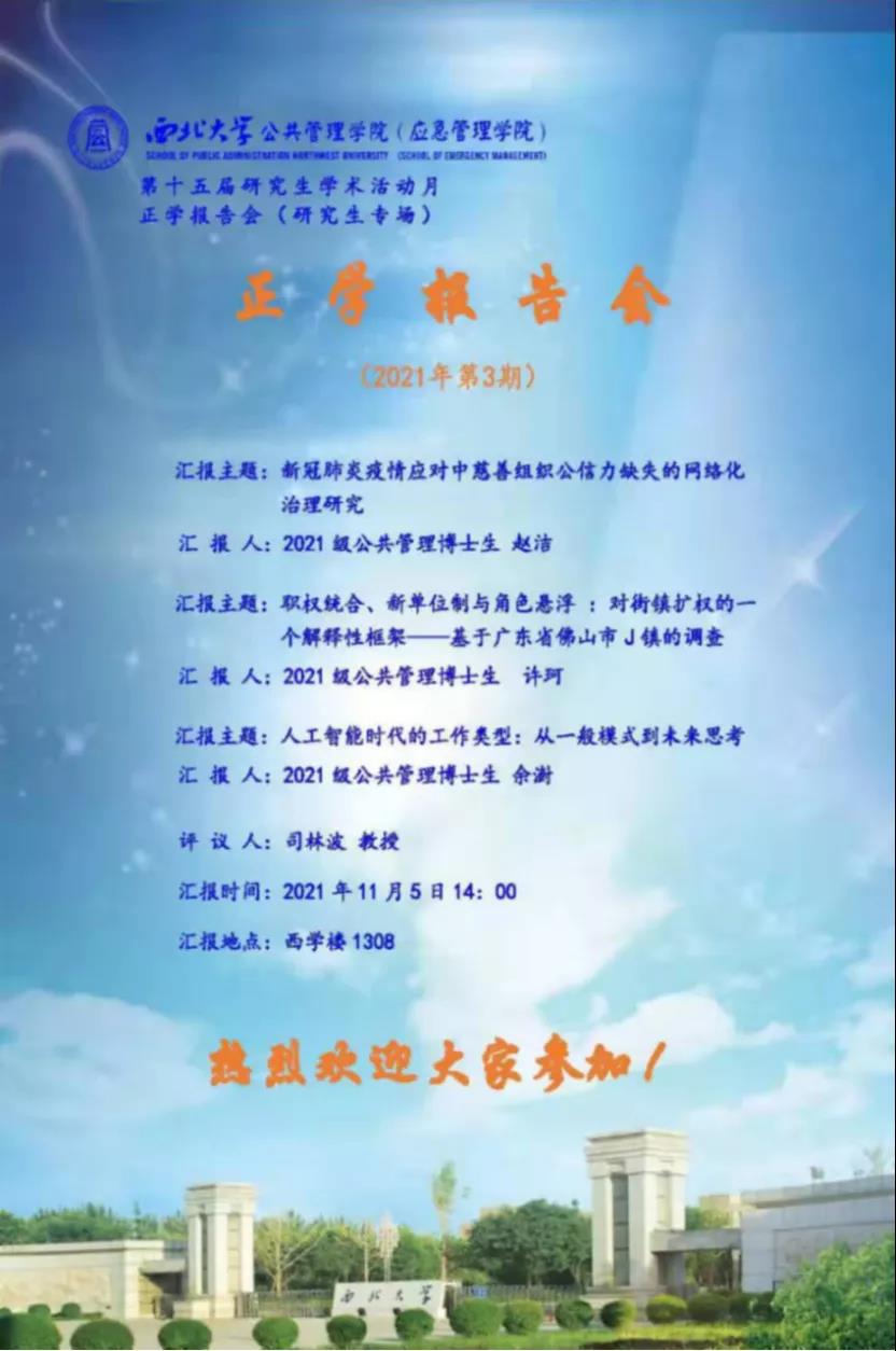 2021年11月5日下午我院举办了本学期第3期研究生学术报告会。2021级公共管理博士生赵洁、2021级公共管理博士生许珂、2021级公共管理博士生余澍主讲,部分研究生旁听了此次报告会。