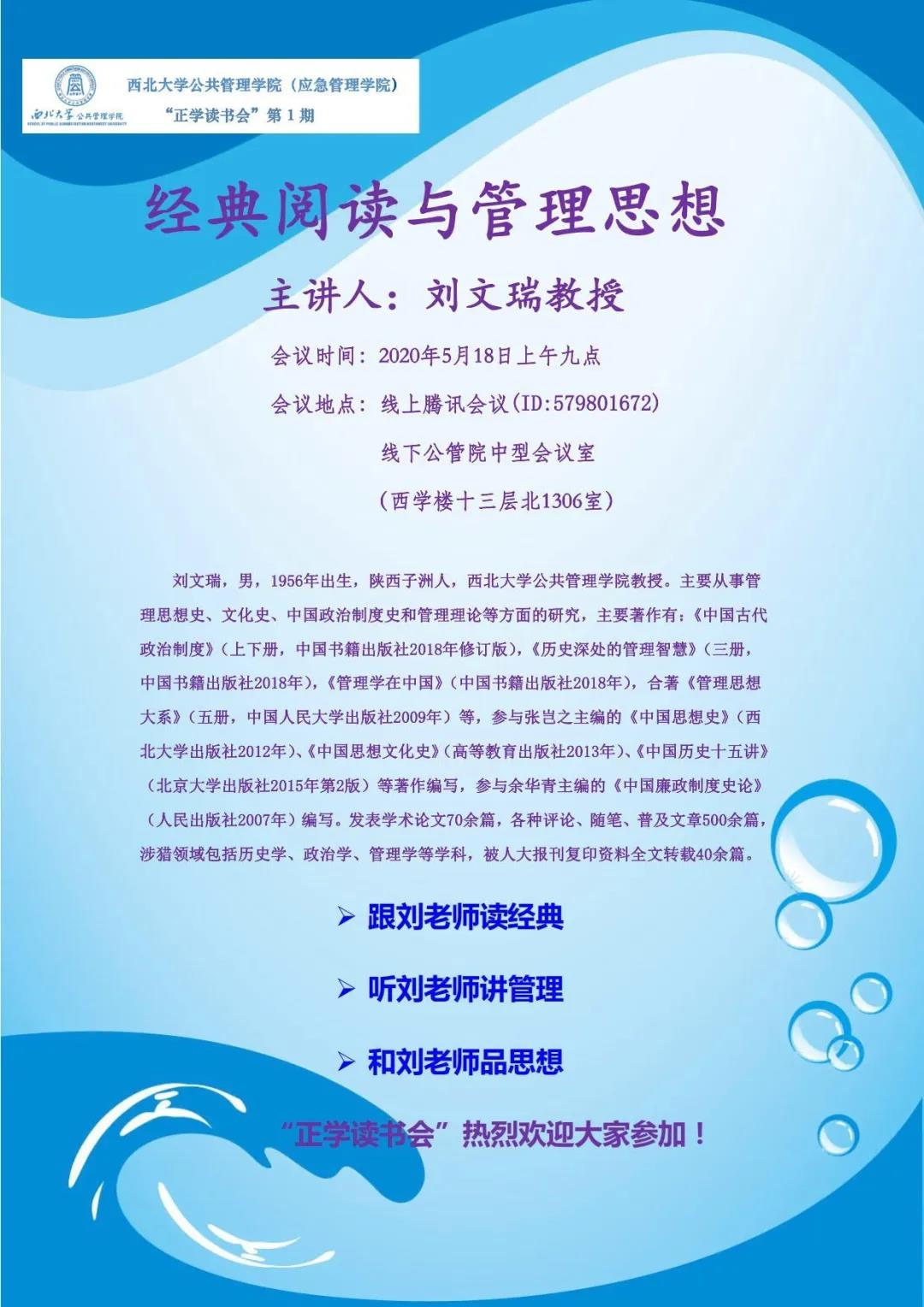 为了进一步营造良好的学术氛围,提高广大研究生的读写思考能力,5月18日上午,我院举办了第一期“正学读书会”。本期主讲人刘文瑞教授围绕“经典阅读与管理思想”主题展开分享与讨论。本次读书会采用线上线下结合的形式,由学院科研副院长翟绍果教授主持,张正军教授、黄新荣教授等多名老师和学生参加了本次会议。