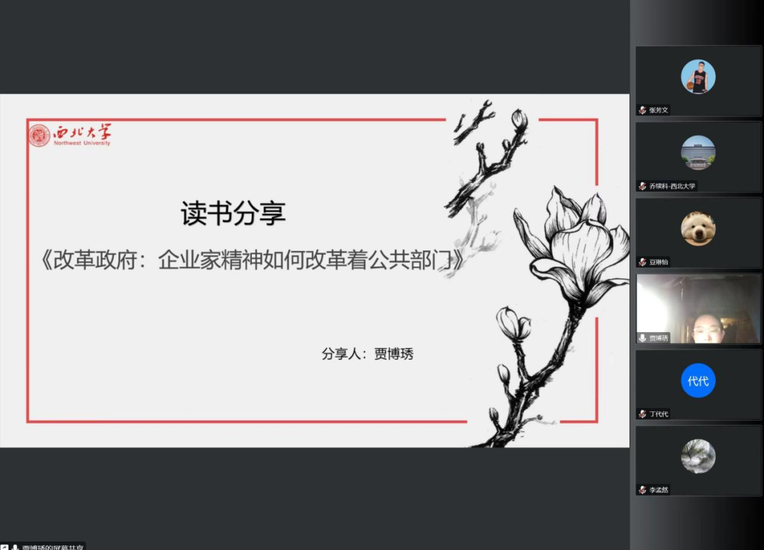 2021级行政管理专业硕士研究生贾博琇同学汇报的书目是奥斯本和盖布勒的《改革政府:企业家精神如何改革着公共部门》,她从作者简介、政治背景、本书简介、章节内容和总结思考五个方面进行分享。首先,指出了本书主要介绍了为改革美国政府而开出的十种“药方”,主要思路就是用企业家精神来克服官僚主义。其次,通过“药方”内容+案例分析+塑造方法的方式对每种药方的具体内容进行了介绍。最后,提出了阅读本书的思考,认为我们要从美国政府的经验中借鉴有益的东西,学会用全新的眼光看待政府和政府的角色以及政府职能的实现。