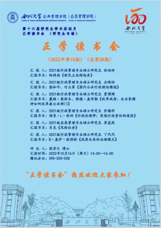 2022年10月16日下午我院举办了2022年第15期研究生读书会。此次读书会由2021级行政管理硕士研究生孙培玲、豆琳怡、贾博琇、乔续科、丁代代以及2021级应急管理硕士研究生李孟然主讲,565net必赢2021级博士研究生张芳文担任评议人,部分研究生旁听了此次报告会。