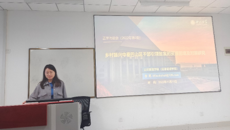李莉博士介绍的题目为《乡村振兴中秦巴山区干部引领致富的资源困境及对策研究》。李莉老师首先指出了社会科学研究和自然科学研究所采用的侧重方法不同,与心理学相比较,公共管理更偏向使用问卷法及调查法来实现学科的研究目的。李莉老师在此基础上立足于乡村振兴的大背景,立足陕西省实现追赶超越和高质量发展大局的战略目标,明确山区干部引领致富的资源困境,从而找准破解困境的发力点,从而实现全省乡村振兴,实现共同富裕。