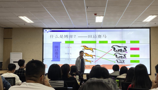 开题之初,周老师以大家耳熟能详的“田忌赛马”历史典故引出“博弈”的主题,并通过“桃园结义”“男女恋爱”等大家感兴趣的故事对几个博弈模型做出了深入浅出的解释,极大地调动了同学们的听课热情。随后,周老师条理清晰地介绍了博弈论的形成发展过程,厘清了博弈论的发展脉络,加深了同学们对博弈论的宏观理解。随即周老师又对近年诺经奖得主的研究方向进行分析,直截了当地提出了博弈论在经济学中的重要性,引起同学们对博弈论这一研究方法的重视。接着,周老师结合日常实例、图表分析及趣味思考题向同学们讲解了博弈论的基本概念及重要模型,使原本生涩抽象的概念通过一条条故事生动起来,变得富有乐趣、易于理解。最后,周老师提供了博弈论的发展方向及前沿的研究思路,为同学们打开了新方法的大门。在讲座结束之际,周老师结合博弈论得出的“生存法则”对同学们提出了寄语:一定要勇于试错,不断努力,奔跑在前进的路上!
