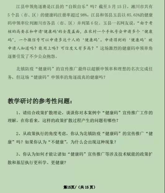 疫情防控期间,北镇政府为了实现政策目标,通过采取“人情攻略”等具有形式主义色彩的工具,短短一周内申领率从10%提升到103.39%。由此,可以看出健康码宣传推广作为最初的政策目标被层层加码,从中央层面到县级层面,政策目标逐渐被置换,申领率逐渐成为基层实践追求的目标,甚至成为基层单位之间的角逐赛。《案例》研究了北镇防疫“健康码”宣传推广政策基层实践中的“不健康”现象及其原因,思考如何避免“不健康”现象的基层再现成为需要人们重点关注、回应与解决的问题。